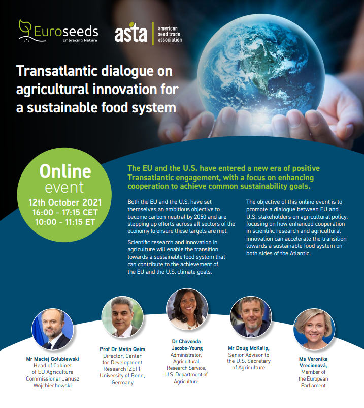 Euroseeds and ASTA collaborated on a high level transatlantic dialogue event on agricultural innovation for a sustainable food system facilitating a new era of positive transatlantic engagement, with a focus on enhancing cooperation to achieve common sustainability goals. Representatives from the EU Parliament, the EU Commission, USDA and science discussed how scientific research and innovation in agriculture can enable the transition towards a sustainable food system that can contribute to the achievement of the EU and the U.S. climate goals.