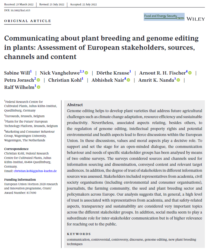 The results were recently published in the open access article “Communicating about plant breeding and genome editing in plants: Assessment of European stakeholders, sources, channels, and content” in the Journal Food and Energy Security.